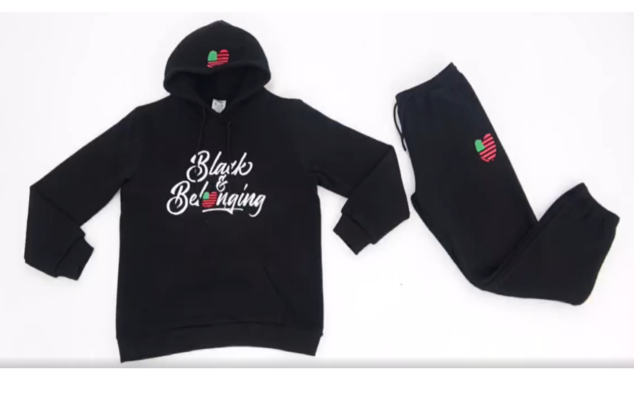 Wear the Black and Belonging Day One Sweatsuit as an expression of pride, love, respect, and solidarity. The emblem on the hood of the sweatshirt brings together the Pan-African flag and the flag of the United States, marrying the two in a heart shape–affirming the wearer’s affinity for Black culture, Black history, and Black people. The Day One Sweatsuit comes in Black with white script lettering. It is designed with an adjustable hooded collar and long sleeves; contrasting text on the chest area; a front pouch pocket; rib trim; and soft plush 100% cotton.